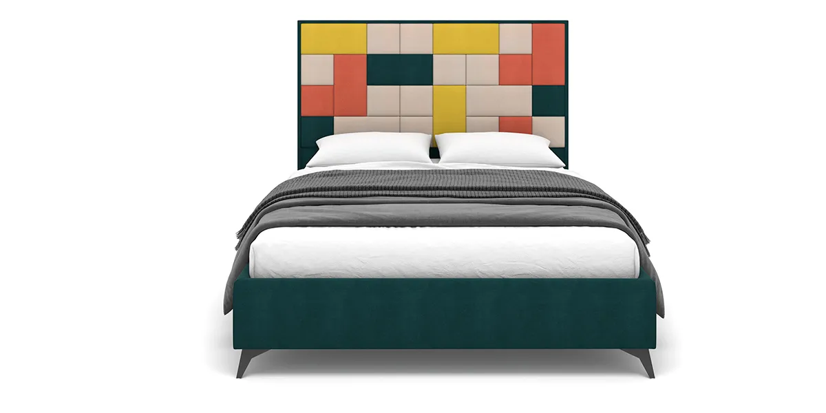Необычная дизайнерская кровать со съемными мягкими панелями 2-х форм: квадрат и прямоугольник. Панели прочно крепятся с помощью липучки велкро к изголовью и позволяют создавать бесконечное множество комбинаций по цвету и форме.