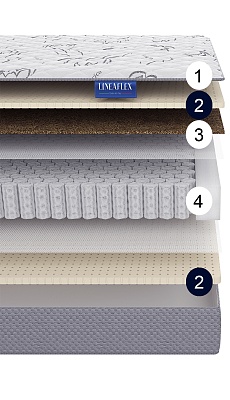 Latex – премиальный, долговечный наполнитель, изготовленный из сока каучукового дерева гевеи. Материал натуральный, имеет пористую структуру, благодаря которой создаётся идеальная вентиляция матраса и не развивается бактериальная флора. Обладает ортопедическим эффектом – упругий и эластичный, позволяет позвоночнику принимать физиологически правильное положение. Coirflex – комфортный слой из натуральной кокосовой койры, пропитанный натуральным латексом (50% волокно кокосового ореха, 50% латекса). Гибкий и упругий, обладает ортопедическим эффектом и устойчив к нагрузкам. Придаёт жесткость матрасу.
